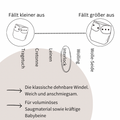 Für ein Neugeborenes eignen sich sehr gut Faltbooster im Winzling. Der absolute Allrounder ist die Hanfflat, diese passt je nach Faltung sowohl in die Winzlinge, als auch in die Windelinge und begleitet euch so über die gesamte Wickelzeit. Das Saugmaterial funktioniert als Baukastensystem. So kann je nach Bedürfnis mit Boostern mehr Saugleistung erzielt werden.
